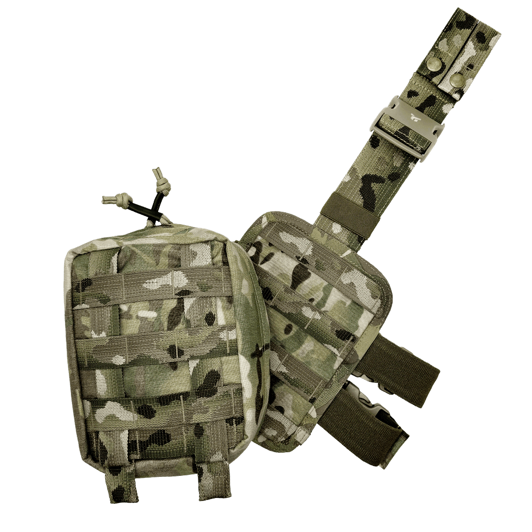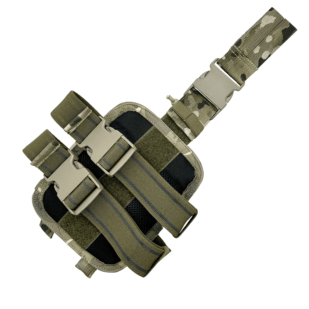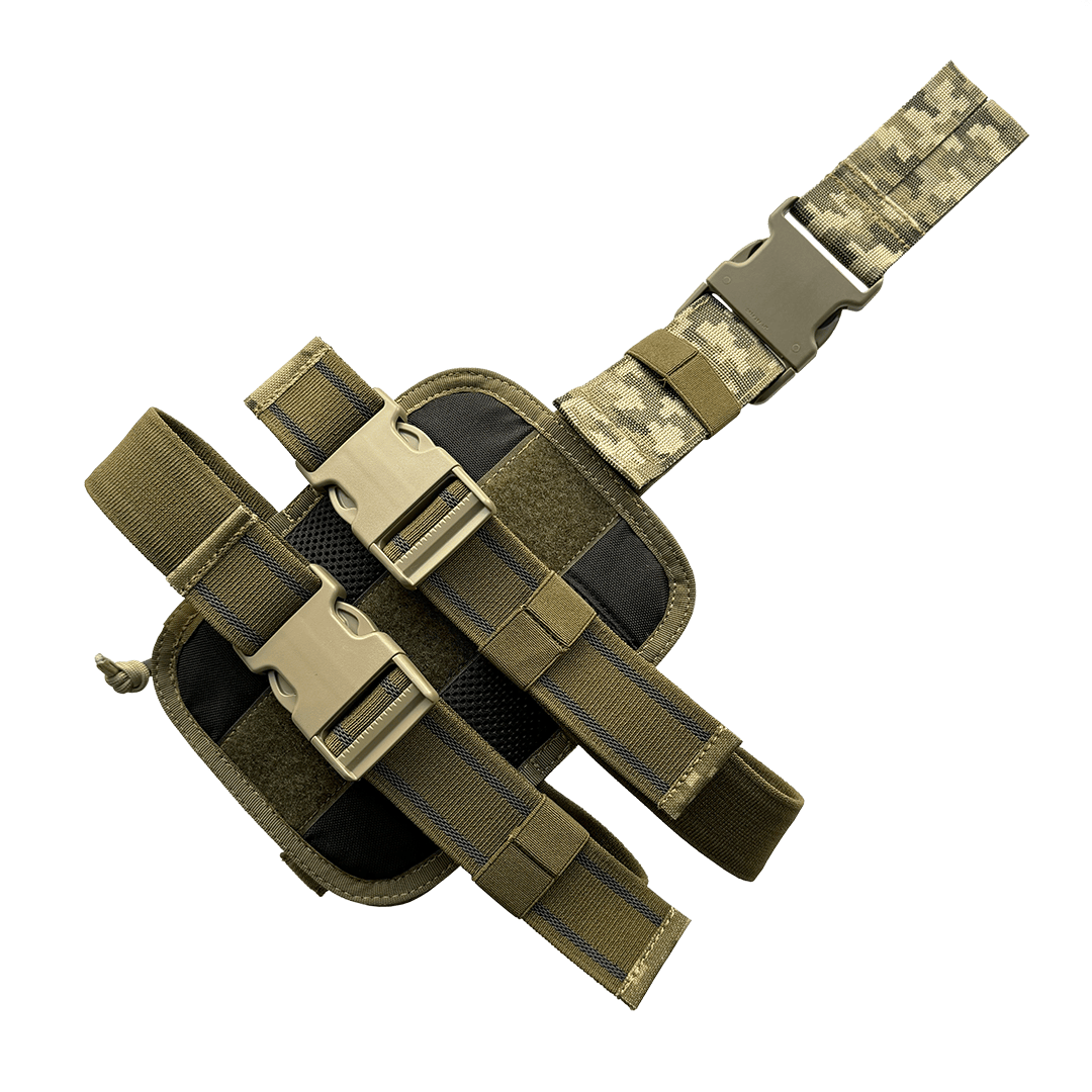 - Кріплення: Підсумок приєднується за допомогою системи «молі» до платформи, що дозволяє зручно закріплювати його на будь-якому тактичному спорядженні. Платформа з підсумком кріпиться на стегні двома еластичними стрічками з застібкою «FAST» та текстильною стрічкою до паска.